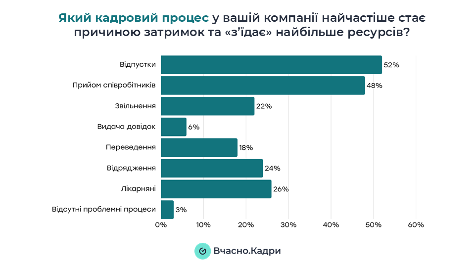 Найбільше часу HR-відділи витрачають на оформлення відпусток — 52% та прийомі нових співробітників — 48%. Менш ресурсозатратними процесами вважають: лікарняні (26%), відрядження (24%), звільнення (22%).