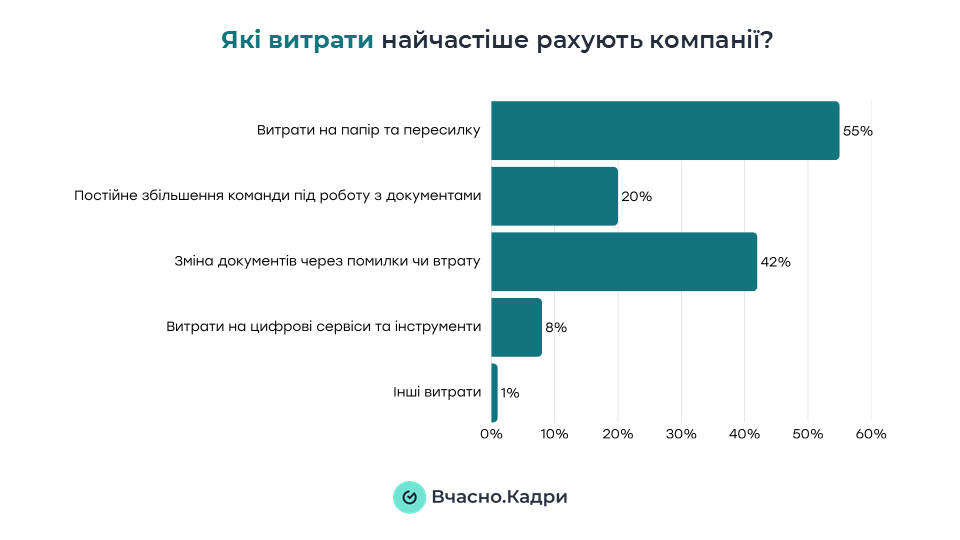 Окрім витрат часу, кадрові процеси створюють додаткові фінансові навантаження. 55% компаній зазначають, що найбільші витрати йдуть на папір та відправку, 42% — на внесення змін через помилки або втрату оригіналів, а 20% — на постійне збільшення штату для роботи з документами.