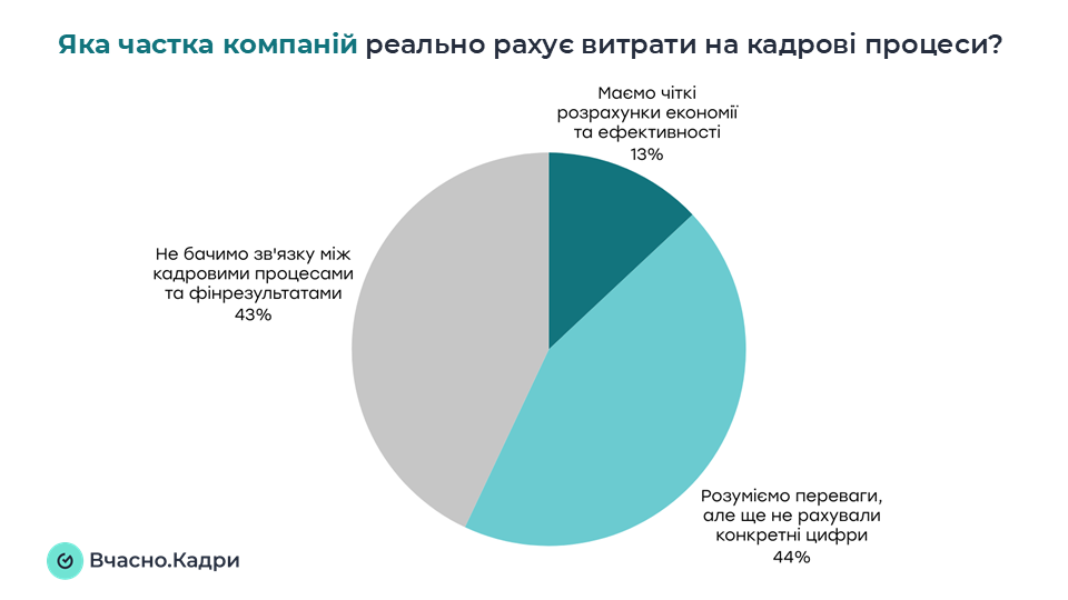 Водночас 43% керівників не бачать прямого зв’язку між кадровими процесами та фінансовими результатами компанії. Ще 44% розуміють потенційні переваги цифровізації, але не мають конкретних розрахунків економії. І лише 13% можуть чітко продемонструвати, як автоматизація впливає на витрати та ефективність.