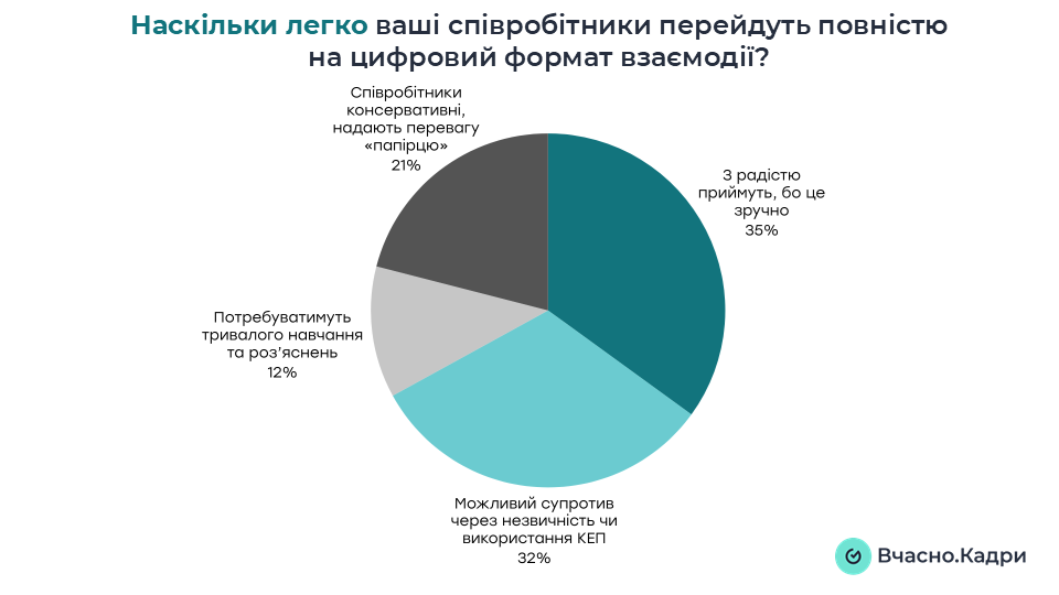 Одним із головних викликів цифрових змін сьогодні — людський фактор. Адже трансформація завжди починається з людей. 35% HR-фахівців вважають, що працівники позитивно сприймуть перехід на електронні процеси. 32% очікують супротив через незвичність нових інструментів або використання КЕП. 21% відзначають, що співробітники консервативні та надають перевагу «паперовому» формату.