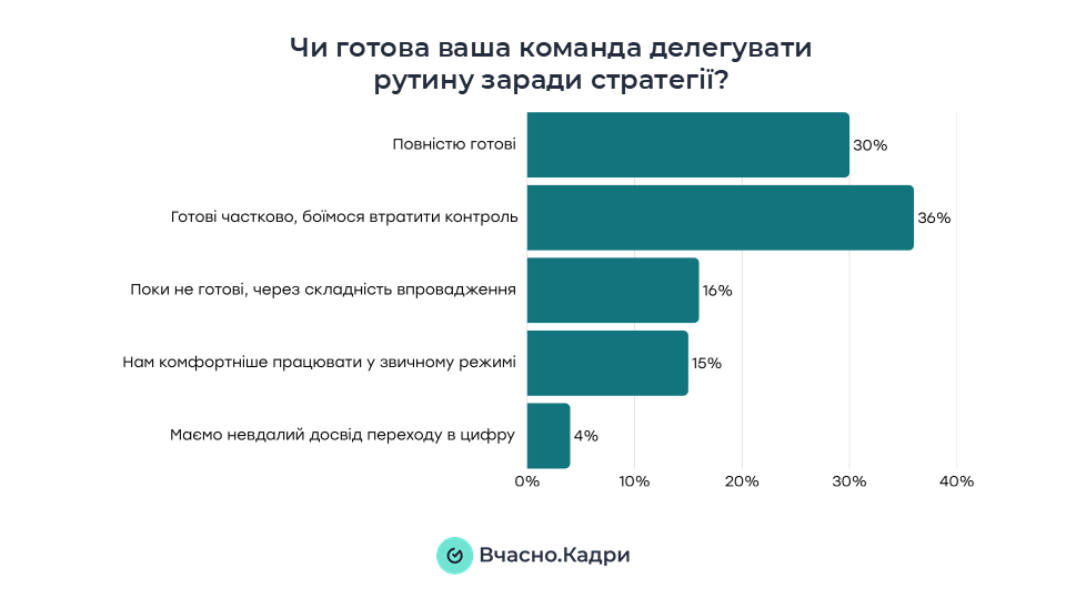 Щодо самих HR-фахівців, то опитування показує що 30% повністю готові до цифровізації, 36% частково готові, але бояться втратити контроль. 16% поки не готові через складність впровадження. А 15% віддають перевагу звичному формату.