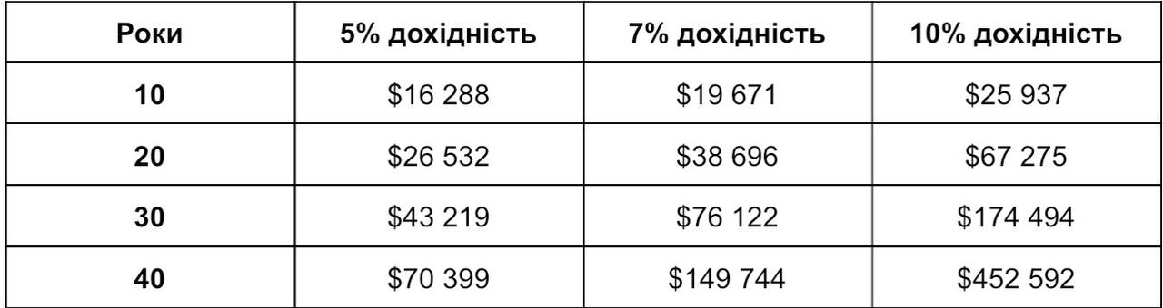 Щоб краще проілюструвати потенціал складного відсотка, розглянемо умовні розрахунки для початкової інвестиції $10 000 без додаткових внесків: