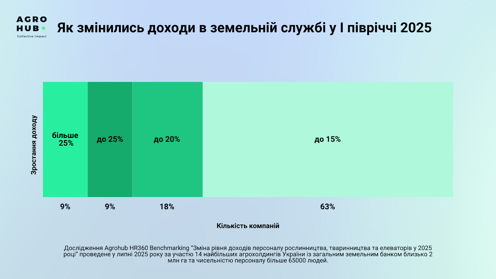 Дослідження Agrohub HR360 Benchmarking “Зміна рівня доходів персоналу рослинництва, тваринництва та елеваторів у 2025 році” проведене у липні 2025 року за участю 14 найбільших агрохолдингів України із загальним земельним банком близько 2 млн га та чисельністю персоналу більше 65000 людей.