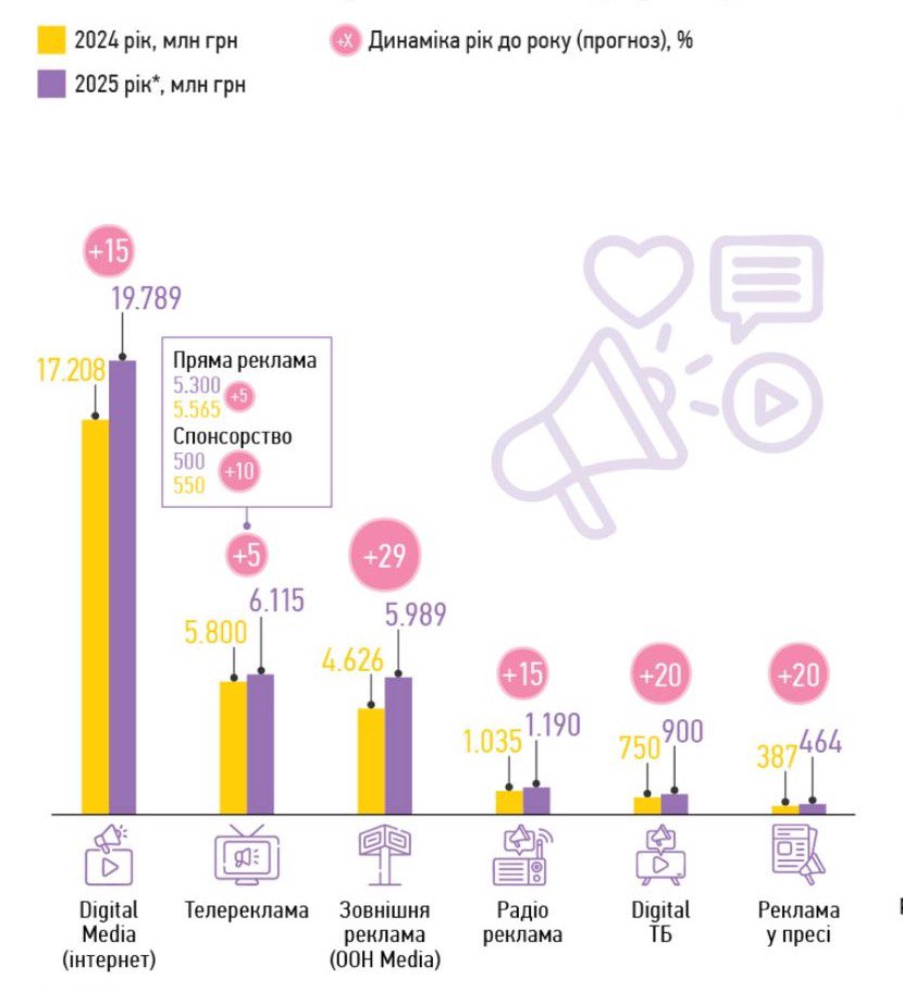 Експерти Всеукраїнської рекламної коаліції оприлюднили прогнози щодо розвитку рекламно-комунікаційного ринку. Зокрема, річний обсяг діджитал реклами у 2025-му, на думку фахівців, становитиме понад 53 мільярди грн, що на 29% більше, аніж за підсумками 2024 року.