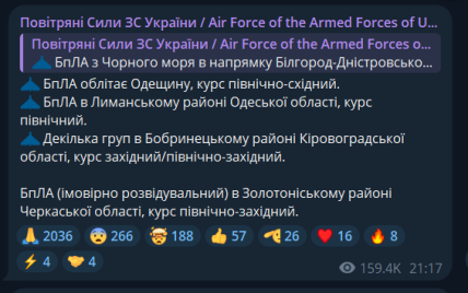 Ранее Воздушные силы предупреждали о сразу нескольких группах дронов разного типа в Кировоградской, Черкасской и Одесской областях.