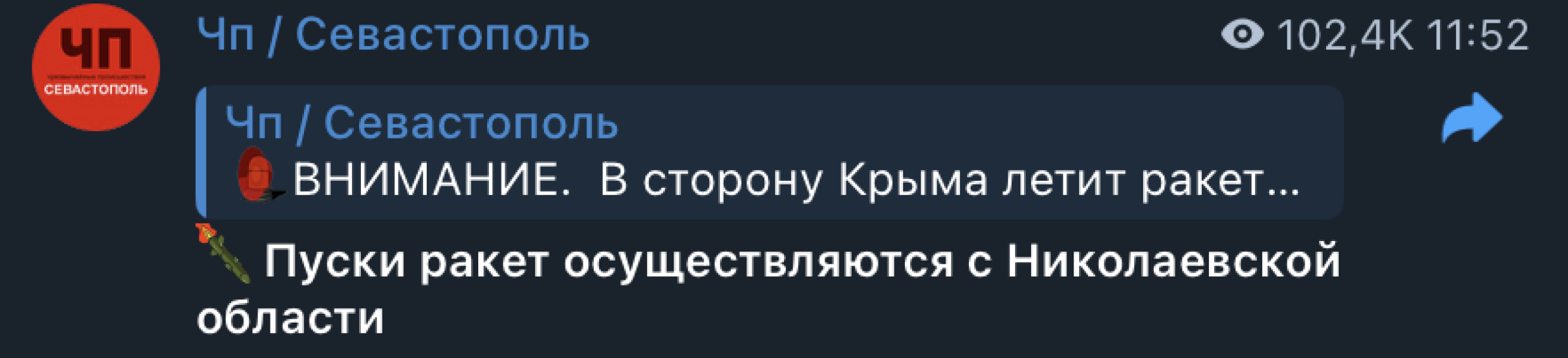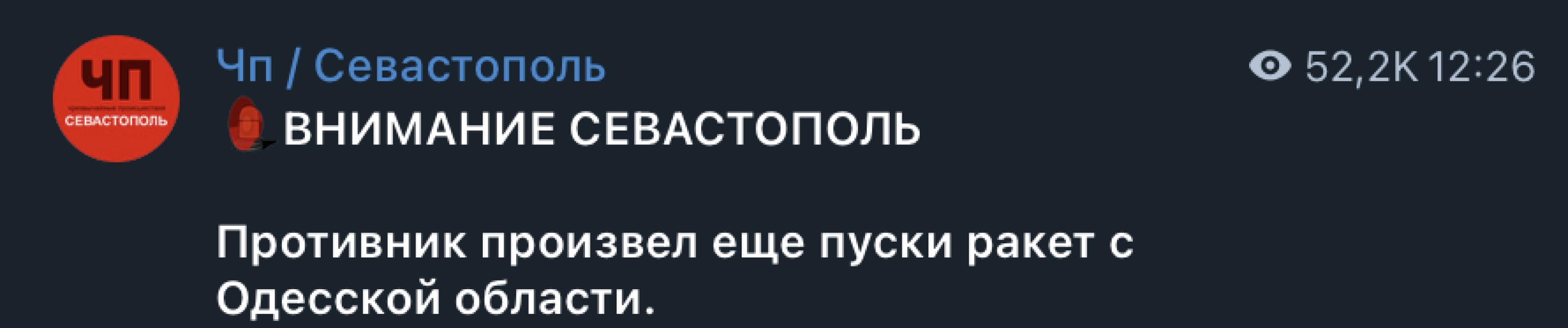 В Telegram-канале «ЧП / Севастополь» рассказали, что по Крыму якобы было запущено несколько крылатых ракет типа Storm Shadow/Scalp. Тогда как российская противовоздушная оборона якобы сбивает их. В частности, якобы над морем, на подлете к Евпатории и Севастополю.