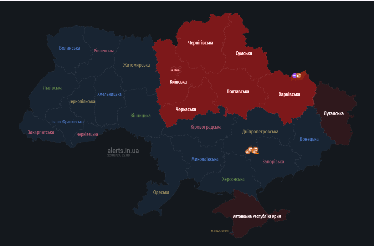 Вечером 22 сентября Киев и ряд областей охватила воздушная тревога. Есть ракетная опасность.