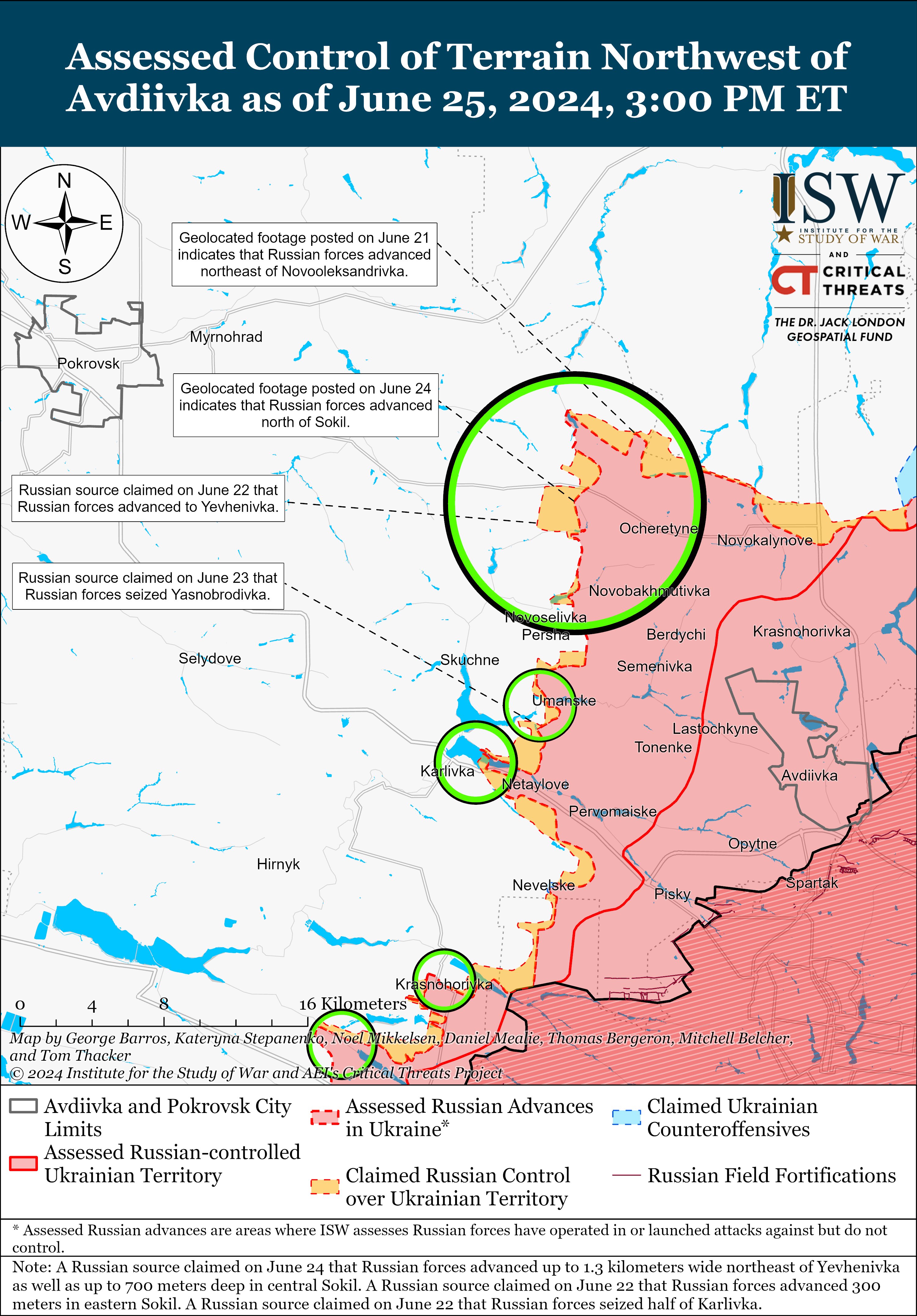 Российские войска недавно продвинулись на северо-запад от Авдеевки в направлении Покровска. Кадры от 24 июня свидетельствуют о продвижении оккупантов в районе к северу от села Сокол. А 25 июня российские «военкоры» распространили изображения, которые также подтверждают, что войска РФ удерживают позиции вдоль трассы O0544 Очеретино-Покровск к северо-западу от Очеретино.