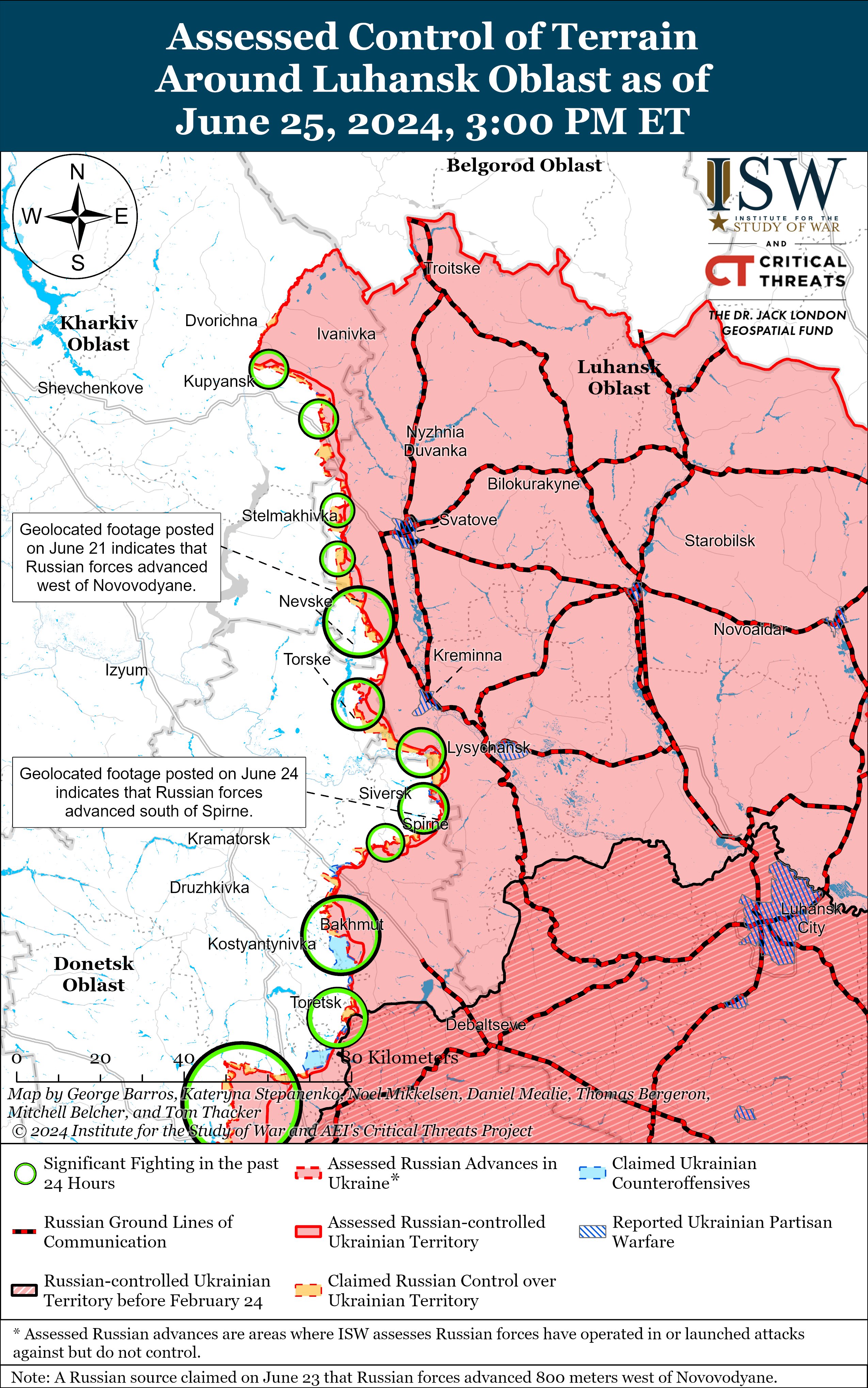 Геолоцированные кадры, опубликованные 25 июня, свидетельствуют, что украинские войска недавно продвинулись вдоль улицы Соборной в центре Волчанска. Бои тем временем продолжались к северу от Харькова возле Липцев и Глубокого и к северо-востоку от Харькова возле Волчанска и Тихого.